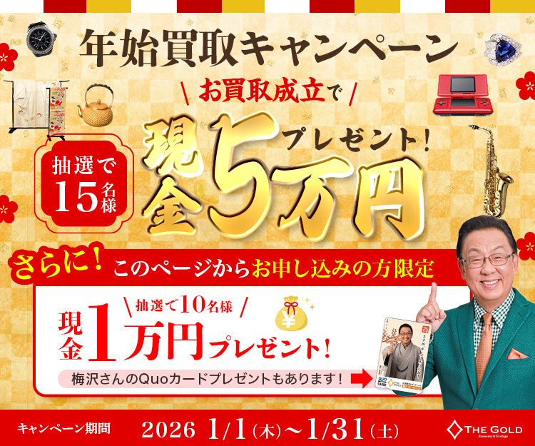 期間中に出張・店頭・宅配買取で買取が成約すると、抽選で現金5万円が貰えるキャンペーン!