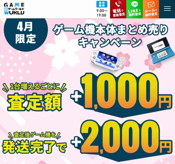 さらに、「まとめ売りキャンペーン」が強力で、ゲーム機本体が1台増えるごとに査定額が1,000円ずつアップします。