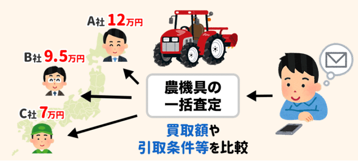 というのも、一括査定は得意な農機具やメーカーが異なる複数社の査定額を、一度の手間で比較することができる無料の査定方法で、あなたの農機具の最高買取額がカンタンに分かるからです。