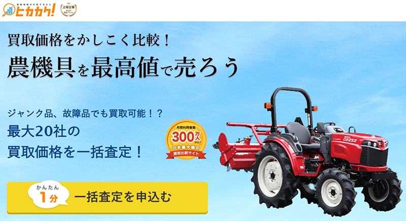買取比較サイトやライフサービス事業等を幅広く手がけていて、農機具の一括査定を含めると月間300万人以上が利用する実績ある無料サービスです。