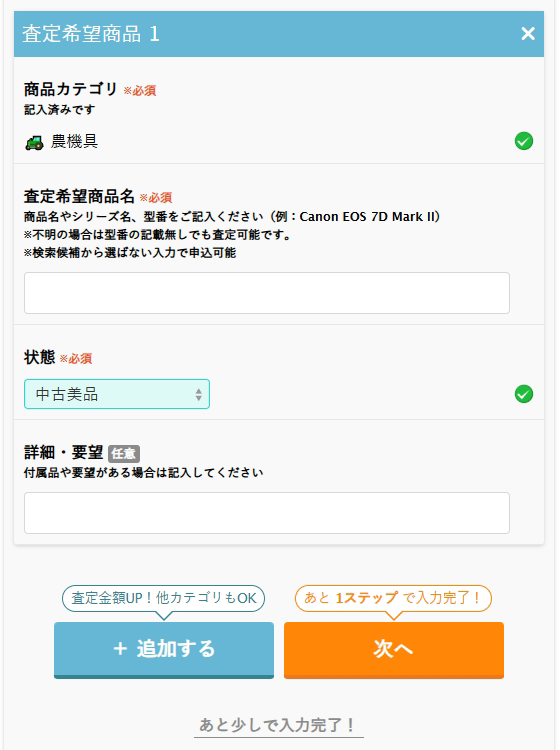 「メーカー/機種名・状態・連絡先」等、60秒程の入力だけで、